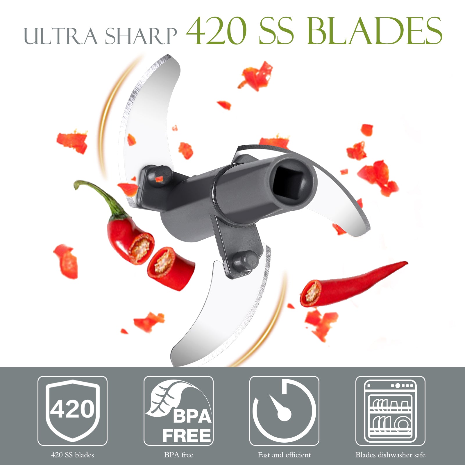 - The blade is extremely sharp: The blades of garlic chopper are made from 425 stainless steel and will not bend or rust. The three blades are arranged in different directions and heights to ensure that all the ingredients can be chop evenly.