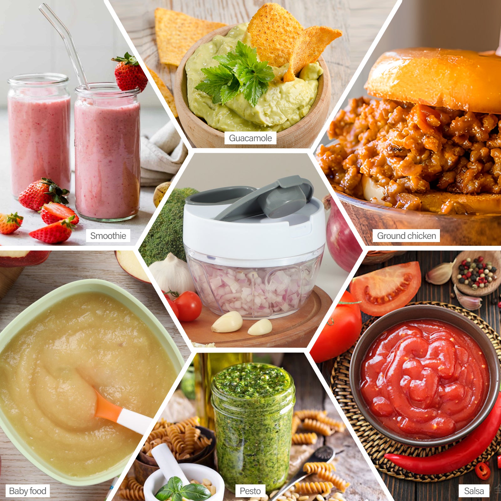 - Versatile manual chopper: It effortlessly handles a wide range of foods, including tomato, onion, garlic, ginger, herb, lean meat, chicken, fruit and more. It is perfect for creating delicious salsa, guacamole, pesto sauce, hummus.