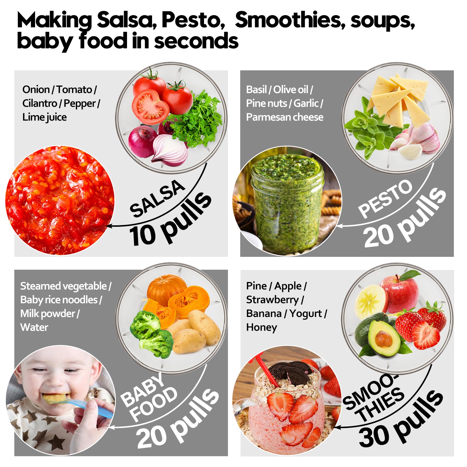 - Achieve food sizes by adjusting the number of string pulls: ten times for coarse chopping, fifteen times for medium and twenty or more for a smooth puree.